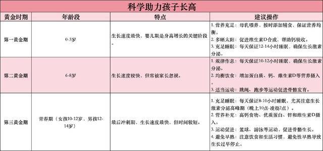 科学研究发现,孩子身高增长有三个关键“黄金期”:0 - 3岁,生长发育第一个高峰期;6 - 8岁,快速生长期;青春期,最后冲刺阶段。